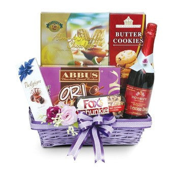 Gulliver Chocolate 120g, Belgian Seashells Chocolate 60g, Royalty Sparkling Juice 750ml, Fox’s Chunkies Fruit & Nut Extremely Chocolately Cookies 175g, Butter Cookies 135g, ABBUS Chocolate Coated Cookies 50g, Flowers & Packaging