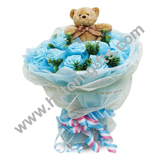 6” Bear with 12 Handmade Blue Roses Hand Bouquet