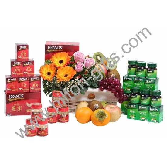 Brands Bird’s Nest with Rock Sugar (6x42g), Brands Essence of Chicken (6x42g), Fresh Mixed Fruits, Flowers & Packaging