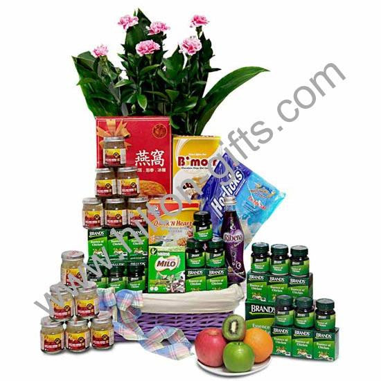Brands Essence of Chicken (6x42g), Bird Nest with Ginseng with White Fungus & Rock Sugar (6x45ml), Ribena Drink, Horlicks Cereal Drinks, Nutro Crackers, Milo Breakfast Cereal, Quaker Oatmeal Porridge, Fresh Mixed Fruits, Flowers & Packaging