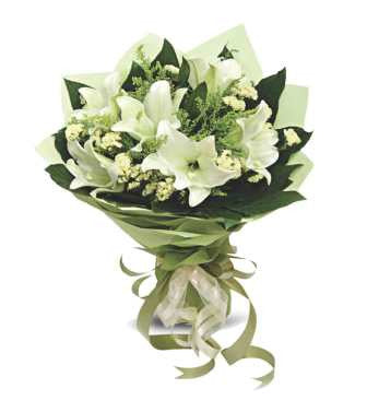 Hand bouquet of easter lilies with forget-me-not