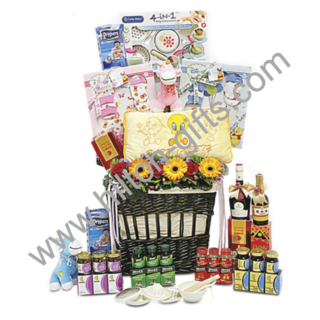 Yomeishu (300ml), Pooh 4pcs Gift Set, 4 in 1 Food Processor, Brands Birds Nest with Rock Sugar (3 x 42ml), New Moon Hashima with Red Dates & Rock Sugar (3 x 70ml), Brands Essence of Chicken (3 x 42ml), New Moon Essence of Fish with American Ginseng (3 x 70ml), Tweety Pillow, Deer Plush, Drypers 4’s, Flowers & Packaging